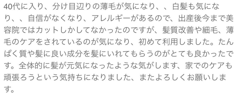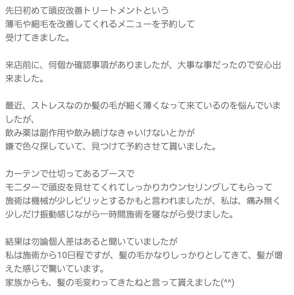 当店は美容室であるため、いつものカットやカラーなどの感じで来れるので、発毛ケア専用サロンのように敷居が高くなく気軽に通えます。